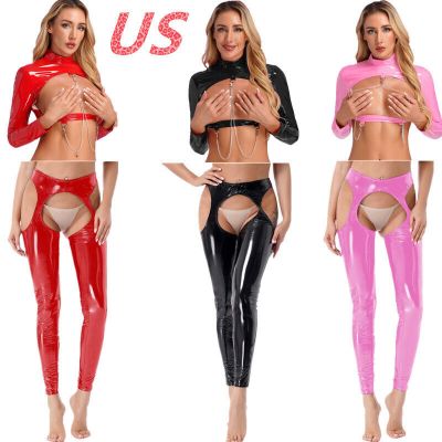 US Womens Patent Leather Lingerie Set Wet Look Blouse Pants