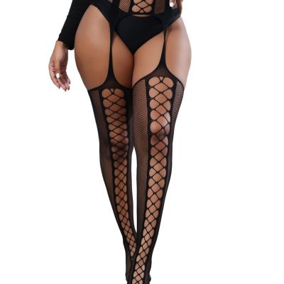 High Waist Fishnet Tights, Thigh High Large-X-Large Black Suspender 6050