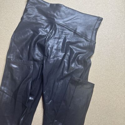 Spanx Faux Leather Leggings Size Large High Waist Black Shiny Ankle Stretch EUC